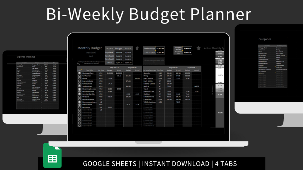 Bi-weekly Paycheck Planner Noir | Paycheck Budget Sheet | Google Sheets Budget Spreadsheet | Personal Finance